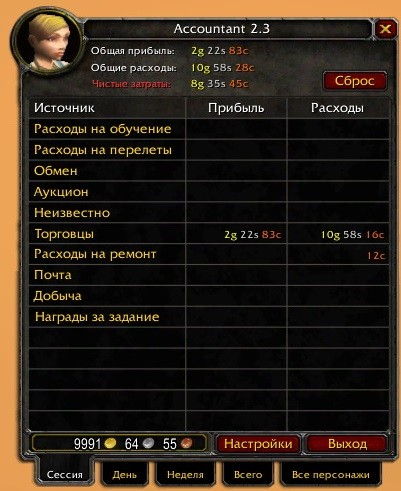 Крутой аддон Accountant покажет вам как, где и сколько вы потратили или же заработали ваши кровные золотые. Он будет полезен голд фармерам, да и тем кто любит просматривать разного рода статистику.